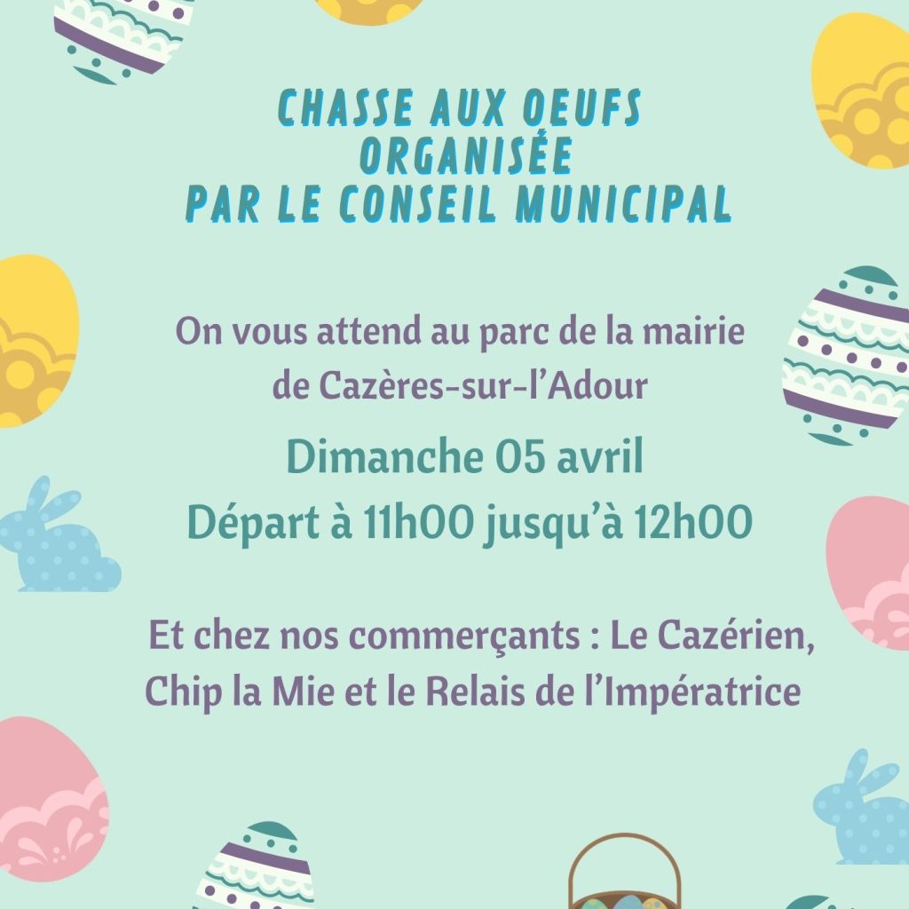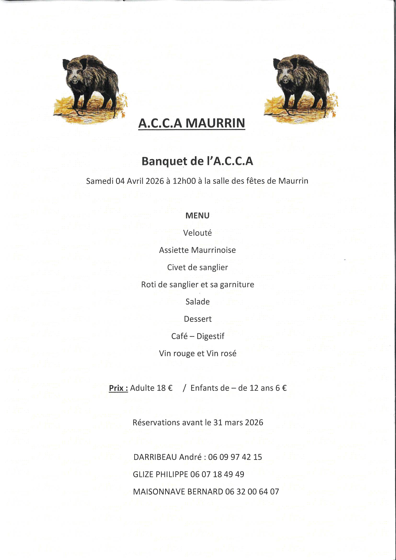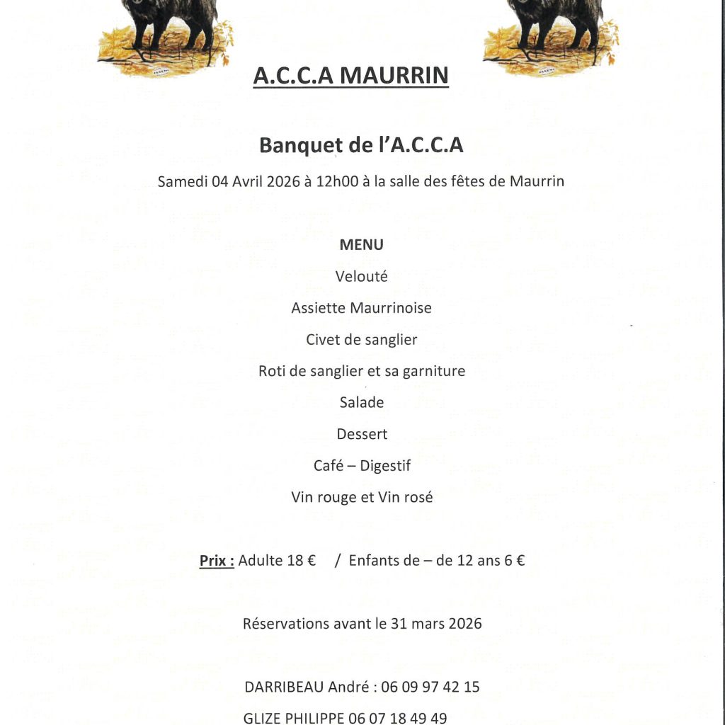 Inscriptions à la mairie avant le 20/03 dernier délai ( fermé le mercredi ) : 05 58 44 06 68 – paiement à l’inscription. 20€ adulte et enfant -12 ans 12€