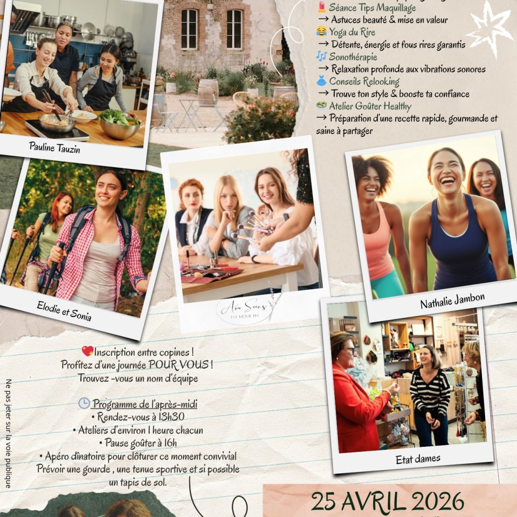 RDV à partir de 13h30 pour profiter des ateliers au choix (1h/atelier) : randonnée, séance tips maquillage, yoga du rire, sonothérapie, relooking, atelier goûter healthy.